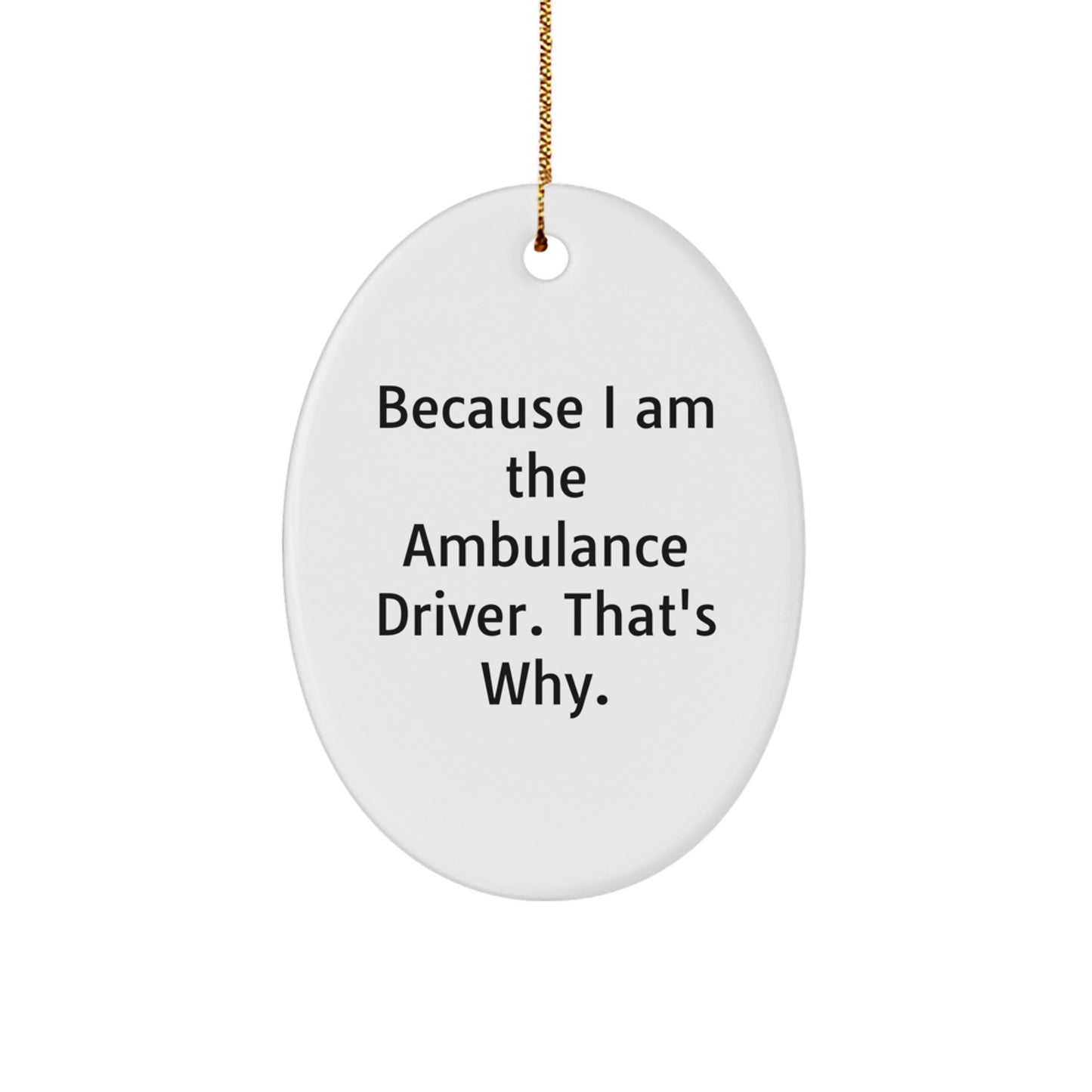 - This Ambulance Driver Oval Ornament is a unique and thoughtful gift idea for the Ambulance Driver in your life. The funny quote 'Because I Am The Ambulance Driver. That's Why.' is printed in a vibrant and eye-catching manner, making it a perfect addition to any room.