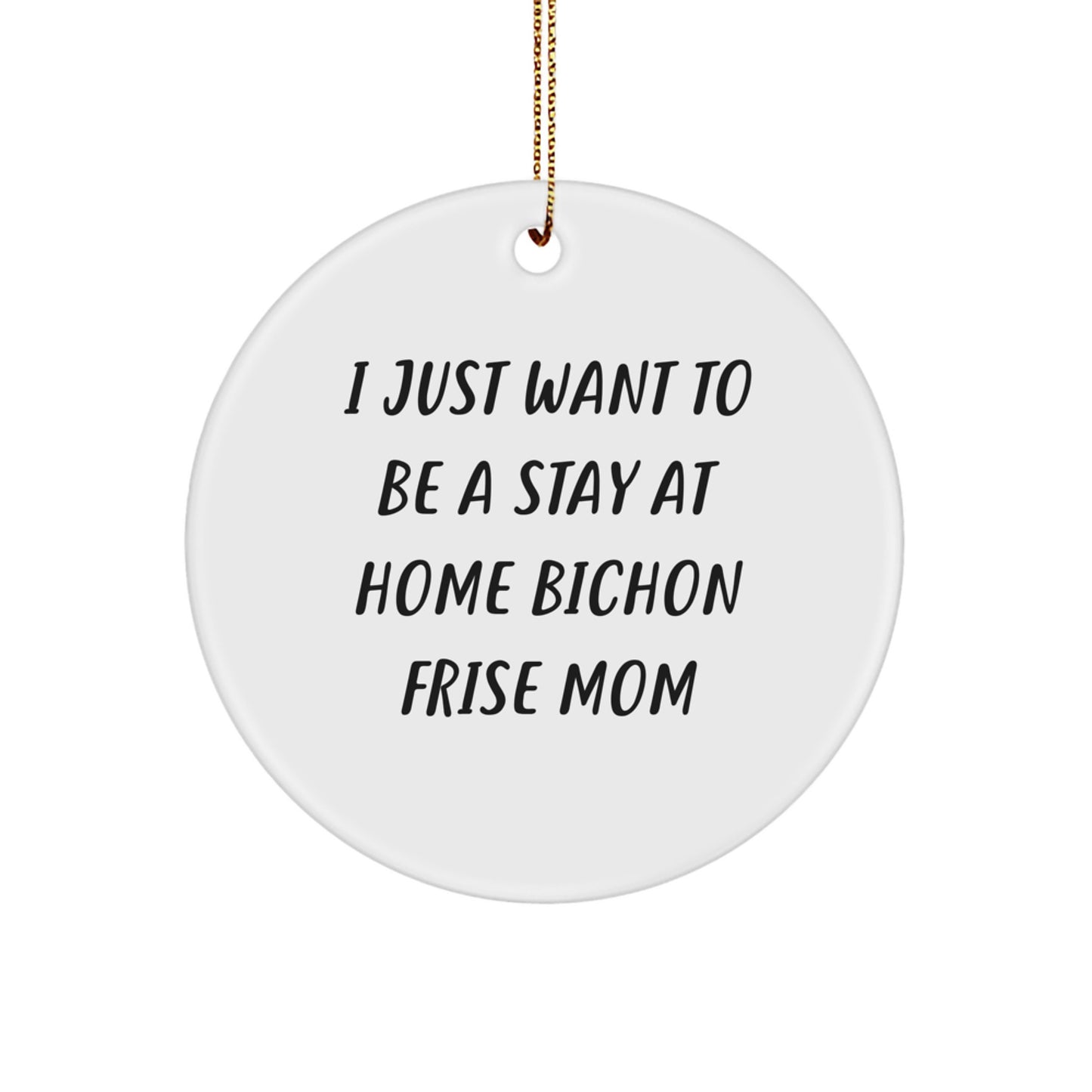 - 'I Just Want To Be A Stay At Home Bichon Frise Mom' will love this delightful Circle Ornament, perfect for decorating their home and showing off their adorable Bichon Frise dog's cuteness. Made from durable MDF with a high-gloss plastic finish, this ornament is designed to last and withstand rough handling, making it a great choice for households with children and pets. Its vibrant colors and beautiful design ensure it will stand out on any Christmas tree or mantel.