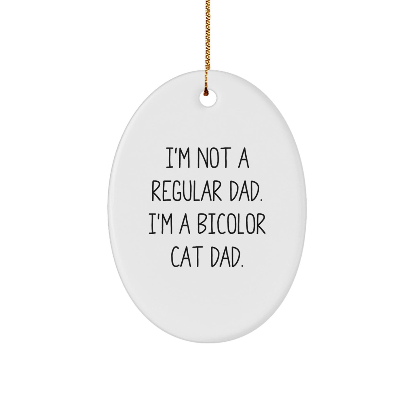 Are you a proud Bicolor Cat parent? Do you want to express your love and humor for your feline friend? Look no further! Our Bicolor Cat Dad Oval Ornament is the ideal gift for you. With its vibrant colors and funny quote, 'I'm Not A Regular Dad. I'm A Bicolor Cat Dad.', this ornament is sure to bring a smile to your face and a warmth to your heart. This unique gift is ideal for Bicolor Cat enthusiasts, cat lovers, and anyone who appreciates a good sense of humor. Make it a special Christmas gift for your loved ones. You can gift it to your friends, family, or coworkers, and they will surely cherish it.