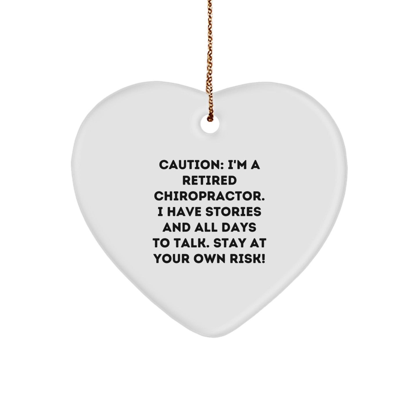 If you know a chiropractor who's always cracking jokes, this heart-shaped ornament is the ideal gift! 'Caution: I'm A Retired Chiropractor. I Have Stories And All Days To Talk. Stay At Your Own Risk!' is a hilarious quote that's sure to bring a smile to their face. Made from sturdy MDF with a high-gloss plastic finish, this ornament is lightweight, resistant to breaking, and easy to hang. It's a great choice for households with children or pets. Whether you're a chiropractor yourself or just a fan of their work, this ornament is a unique and thoughtful gift for the holiday season.