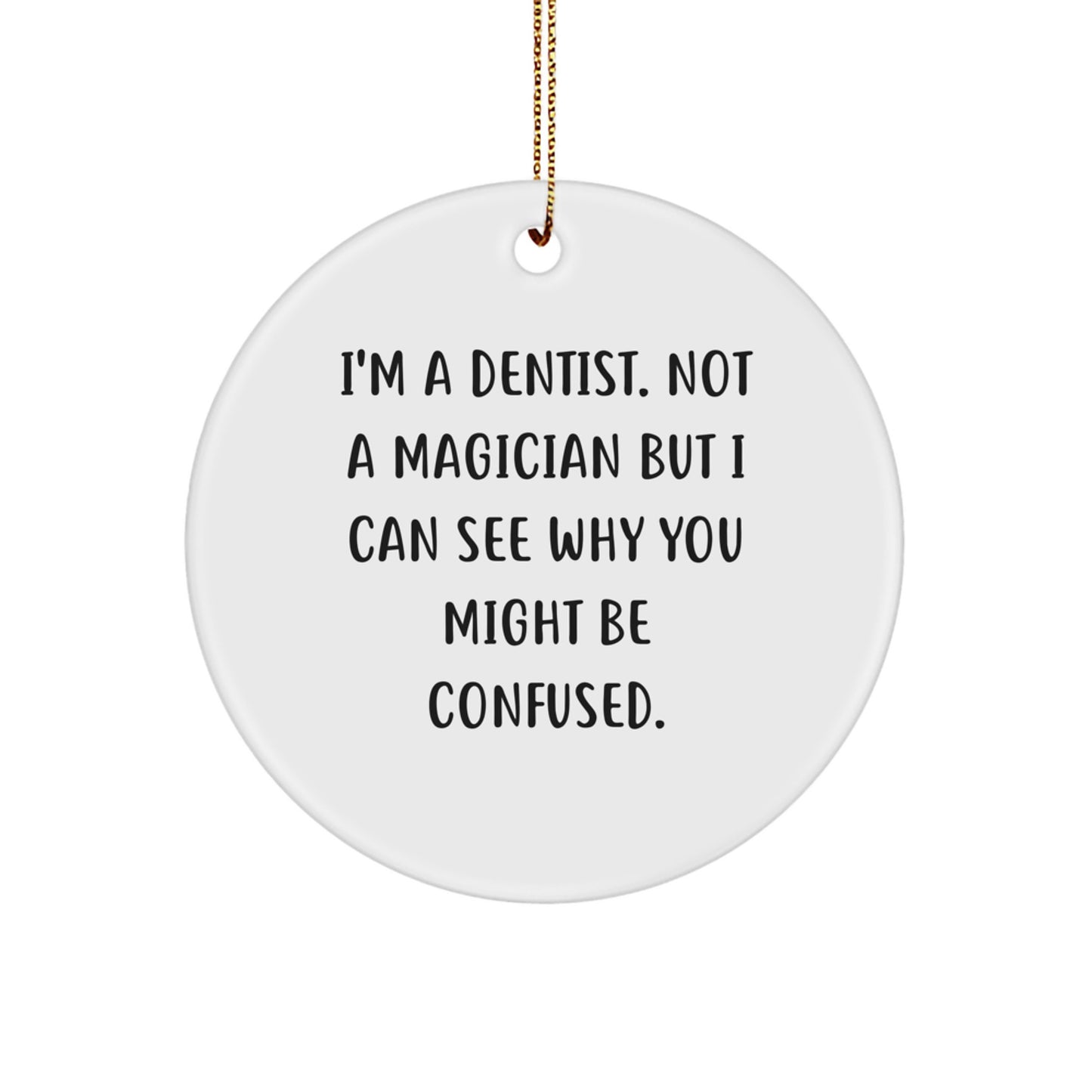 Dentist Gifts from Friends for Christmas - I'm A Dentist. Not A Magician But I Can See Why You Might Be Confused., Circle Ornament, White, 2.75″, MDF, Sublimation, Gold Cord
