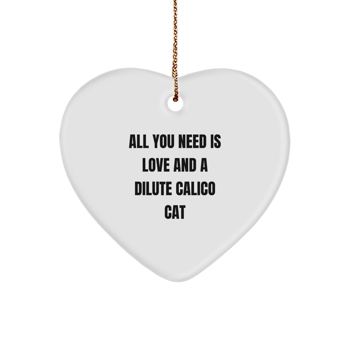 - This Heart Ornament is a thoughtful gift for any Dilute Calico Cat lover, featuring a vibrant and colorful design that's sure to delight. The quote 'All You Need Is Love And A Dilute Calico Cat' adds a touching touch to the design, making it a unique and special gift.
