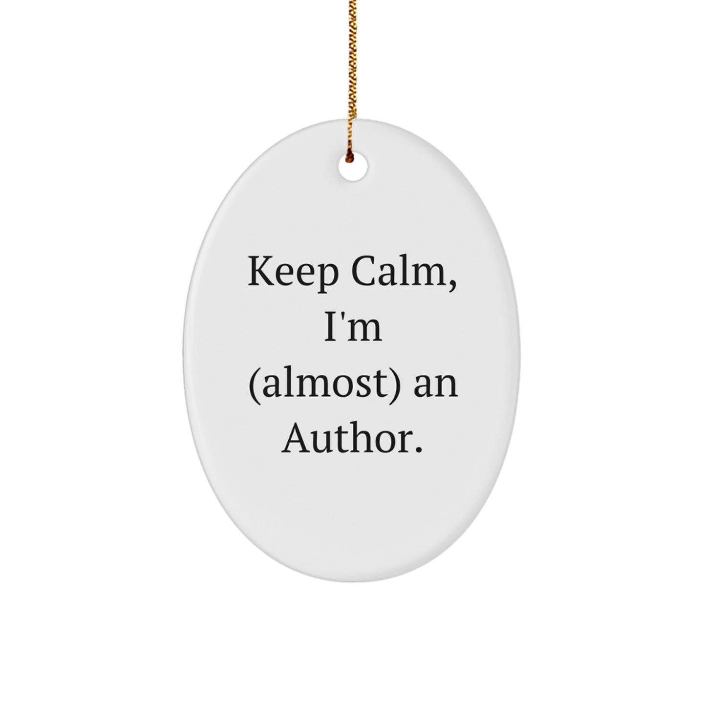- Give the gift of inspiration to the writers in your life with our funny Keep Calm, I'm (almost) An Author. Oval Ornament. Made from sturdy MDF with a high-gloss plastic finish, this beautiful Oval Ornament is vibrantly printed from edge-to-edge via Sublimation, ensuring bright, vivid colors that will last for years to come.