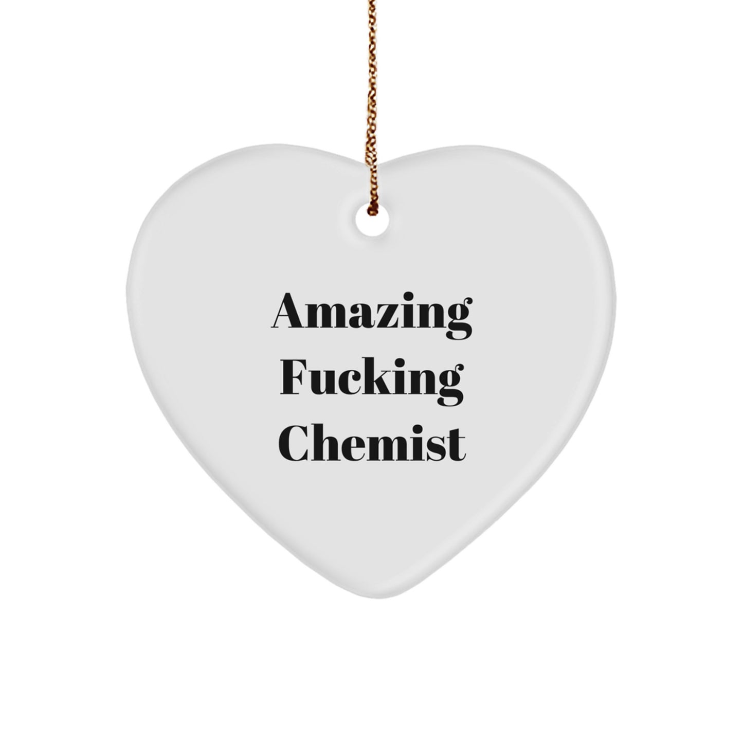 - Show your appreciation for chemists with this funny and unique heart ornament featuring the quote 'Amazing F--king Chemist'. Made from sturdy MDF and a high-gloss plastic finish, this heart-shaped ornament is sure to bring a smile to the face of any chemist. It's a great gift for friends, family, or coworkers who work in the chemistry field.