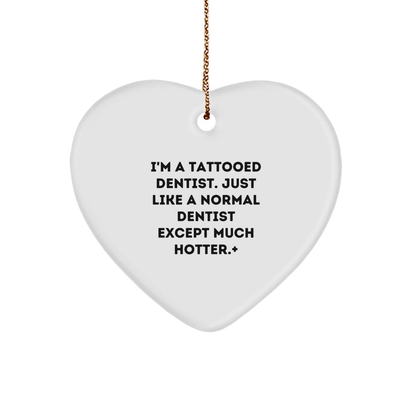 - Whether you're shopping for a dentist gift for Christmas or a birthday, this Heart Ornament is sure to bring joy to the recipient's heart. The festive gold cord for easy hanging makes it a stress-free decorating experience. Order this funny 'I'm A Tattooed Dentist Except Much Hotter+' Heart Ornament today and make someone's day a little brighter!