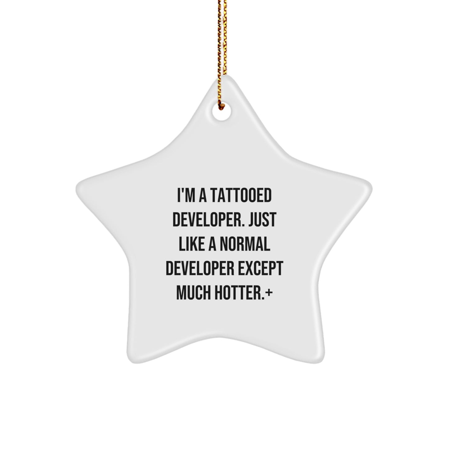 Get your I'm A Tattooed Developer. Just Like A Normal Developer Except Much Hotter.+ Star Ornament today and make this Christmas one to remember. It's a great way to show your love and appreciation for the Developers in your life, and it's a fun way to decorate your home or office for the holiday season.
