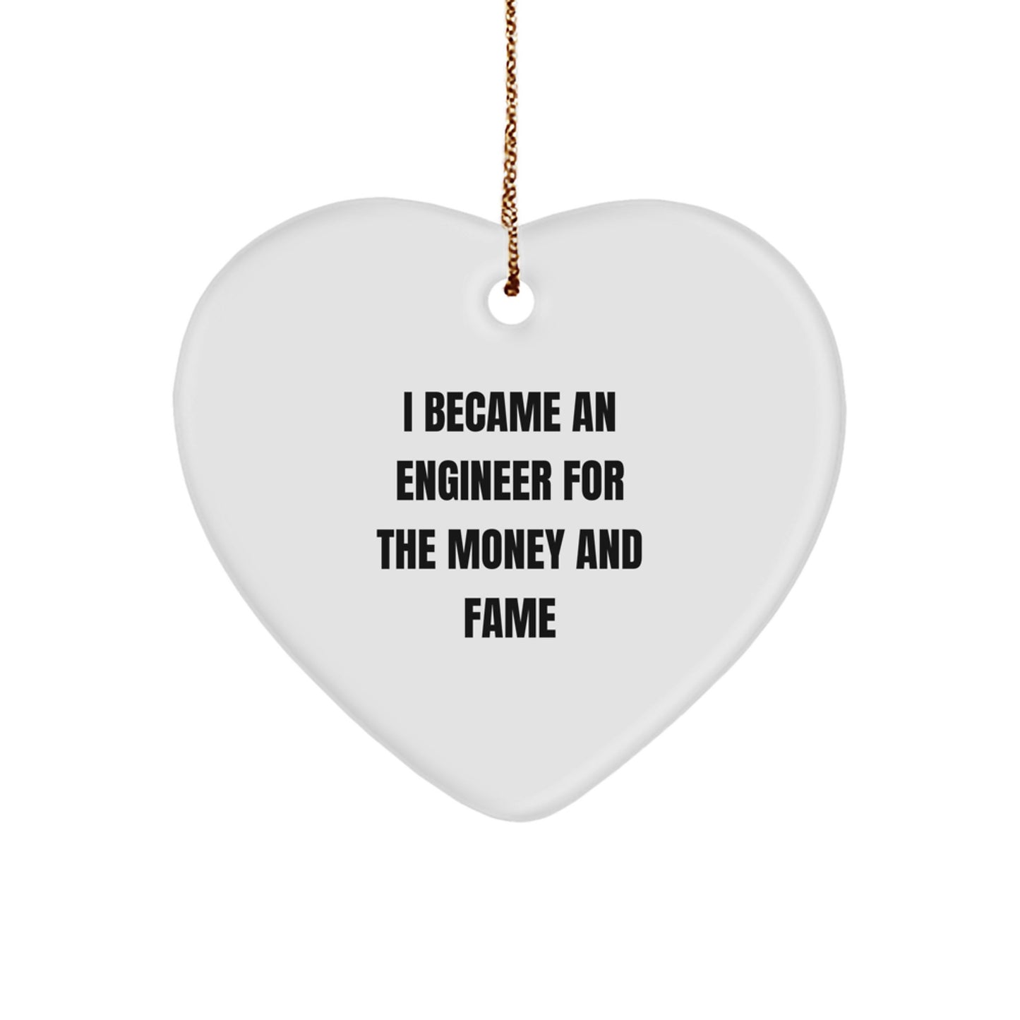 - Our funny engineer gifts, designed with the quote 'I Became An Engineer For The Money And Fame', make a great addition to any office or home decor. They're a thoughtful and unique gift for any engineer, whether it's for a colleague, friend, or family member. The heart ornament is made from sturdy MDF with a high-gloss plastic finish, ensuring bright and vivid colors. It's lightweight and resistant to breaking, making it a great choice for households with children or pets.