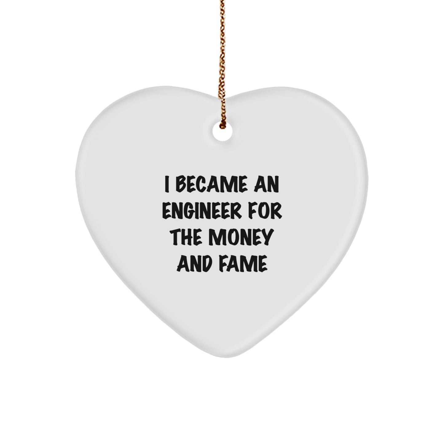 - Get your 'I Became An Engineer For The Money And Fame' Heart Ornament today and make someone's day! This Funny Engineer Heart Ornament is the ideal gift for Engineers who have a sense of humor. Don't miss out and show your love and appreciation for their hard work and dedication.