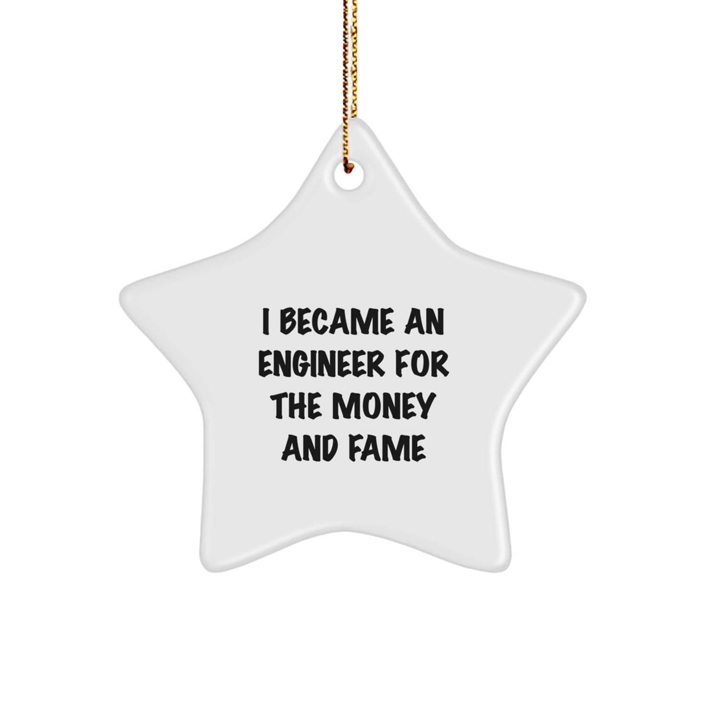 Are you an Engineer looking for a unique Christmas gift for yourself or a fellow Engineer? Look no further! This Engineer Star Ornament is a thoughtful gift idea that showcases the quote 'I Became An Engineer For The Money And Fame' in a stylish and eye-catching way. The star-shaped ornament is beautifully crafted from sturdy MDF with a high-gloss plastic finish, making it a long-lasting addition to any Engineer's workspace or study area.