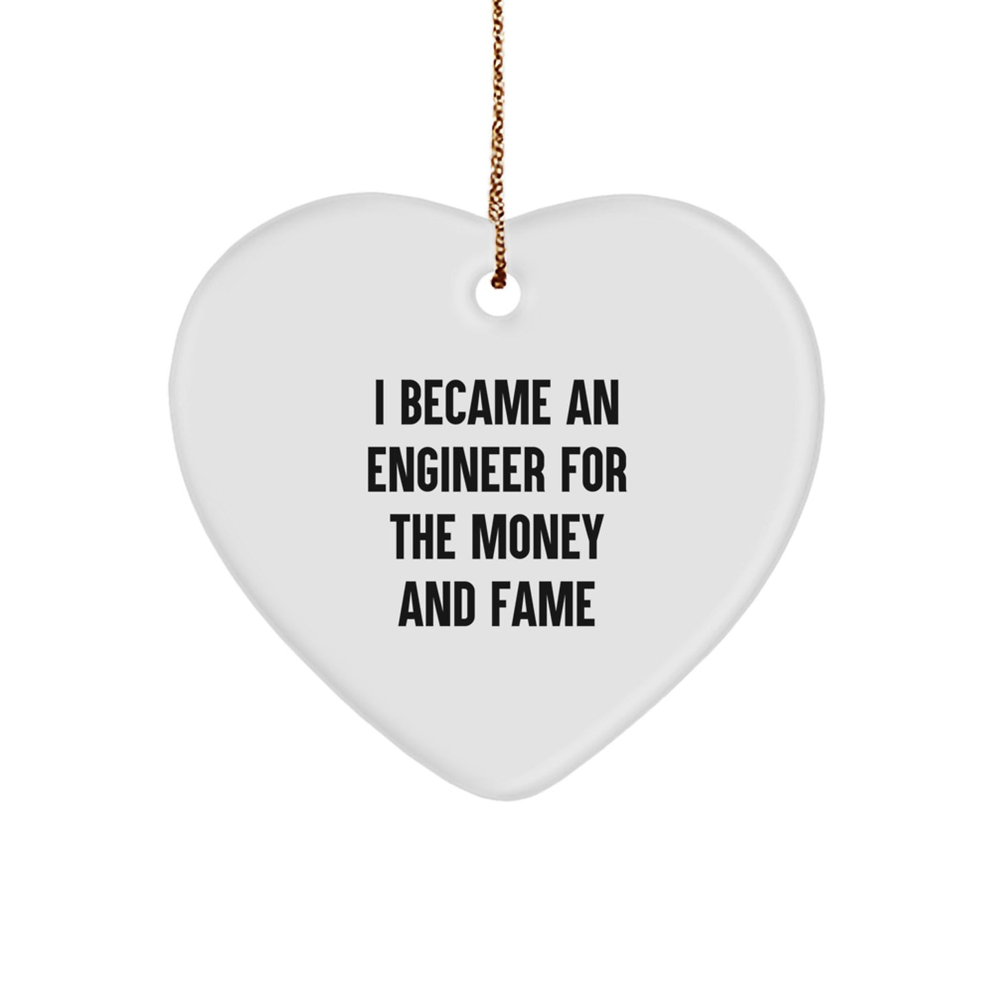 - Don't miss out and give the gift of laughter and inspiration this Christmas. The Funny Engineer Heart Ornament is a beautiful addition to any room, and the quote 'I Became An Engineer For The Money And Fame' is a funny and relatable phrase that will bring a smile to the face of any Engineer man or woman.