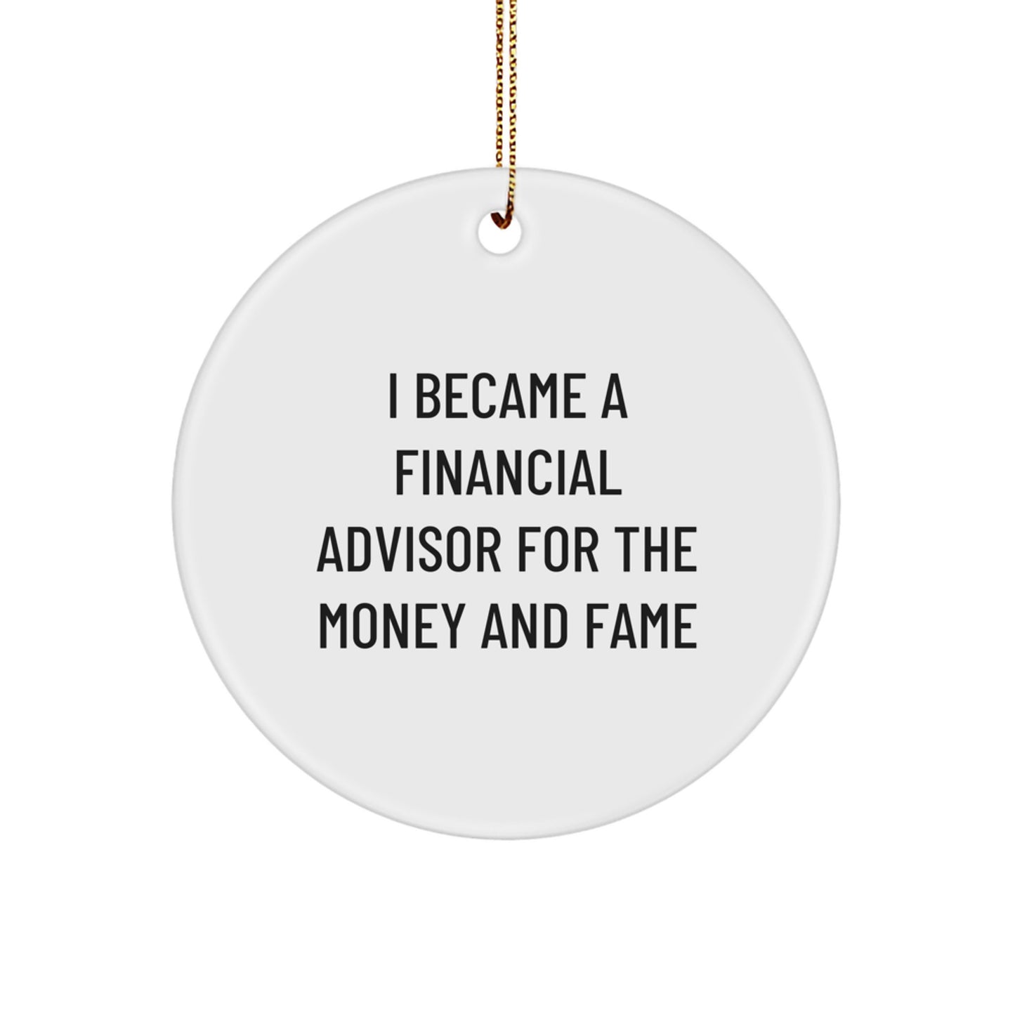 - This funny 'I Became A Financial Advisor For The Money And Fame' Circle Ornament is a unique gift for Financial Advisors or anyone in the financial industry. Made from sturdy MDF with a high-gloss plastic finish, this ornament is vibrantly printed from edge-to-edge via Sublimation, ensuring bright, vivid colors.