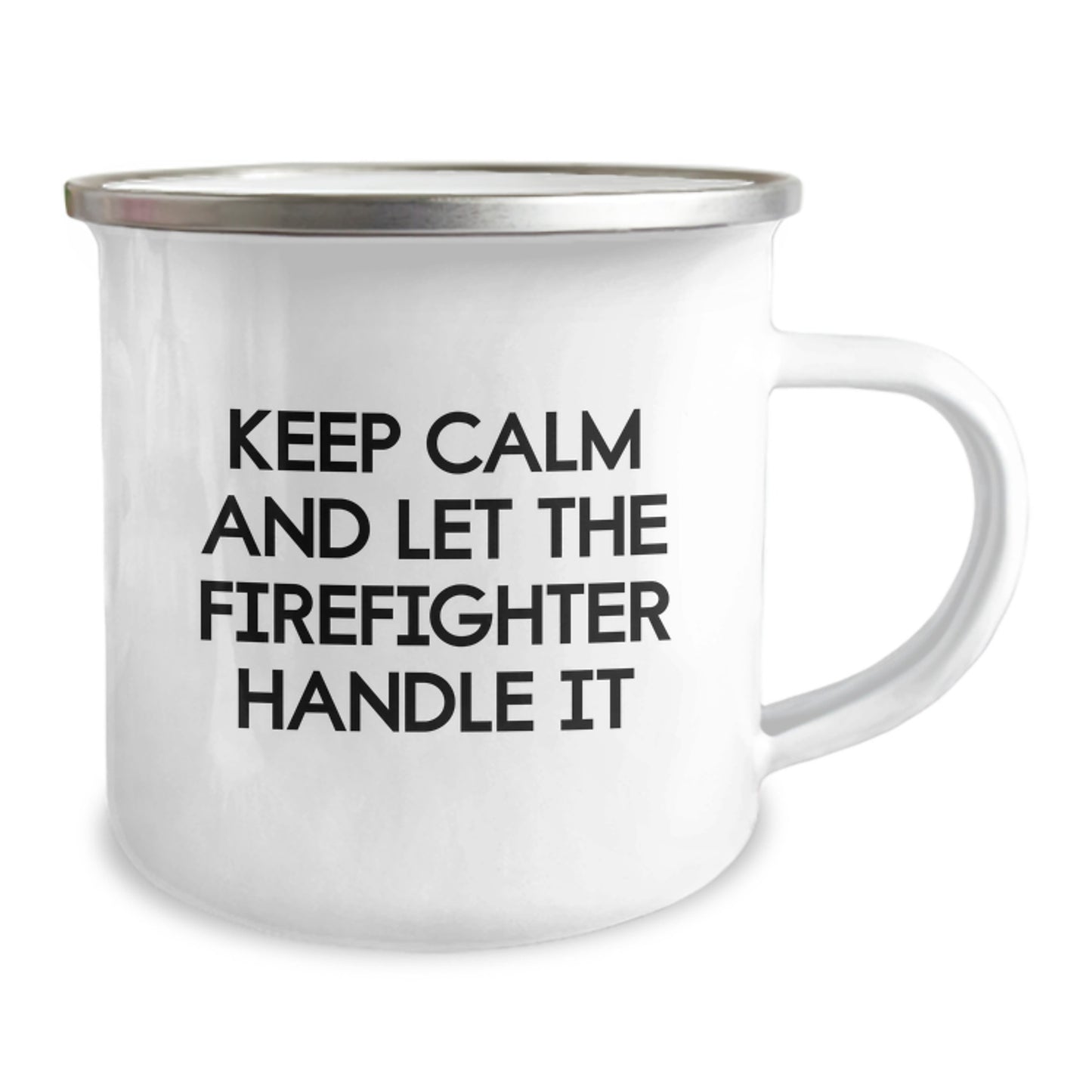 - This funny Firefighter Camping Mug is a great way to show your appreciation for the Firefighter in your life. The 'Keep Calm And Let The Firefighter Handle It' quote is a great way to add some humor to their camping trips.