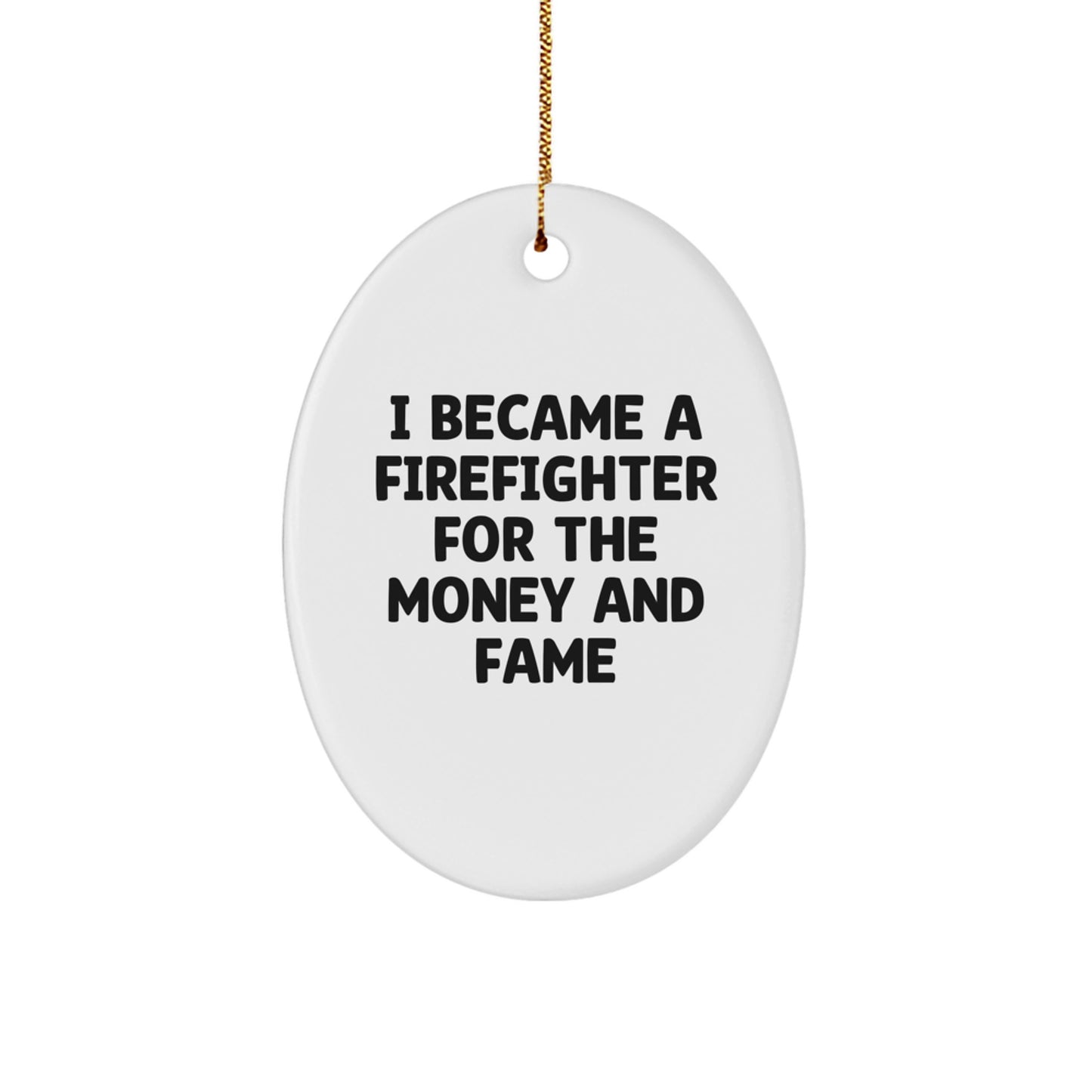 Are you a Firefighter enthusiast or looking for a unique gift for a brave firefighter in your life? Look no further! This Oval Ornament is a great way to showcase your love and admiration for firefighters. The quote 'I Became A Firefighter For The Money And Fame' is a humorous take on the often romanticized profession.