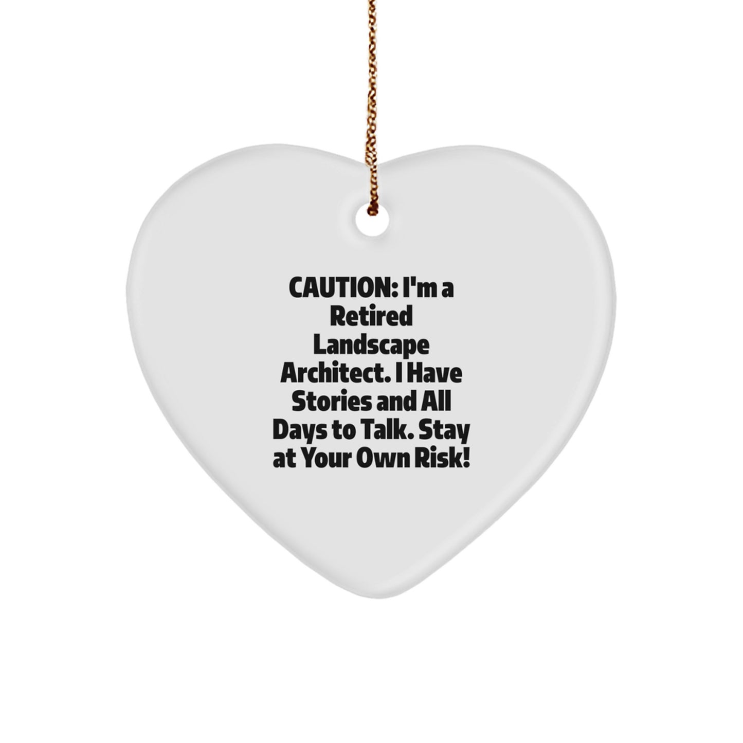 - This heart-shaped ornament is a unique and humorous way to show your appreciation for Landscape Architects. The quote 'Caution: I'm A Retired Landscape Architect. I Have Stories And All Days To Talk. Stay At Your Own Risk!' is sure to bring a smile to their face.