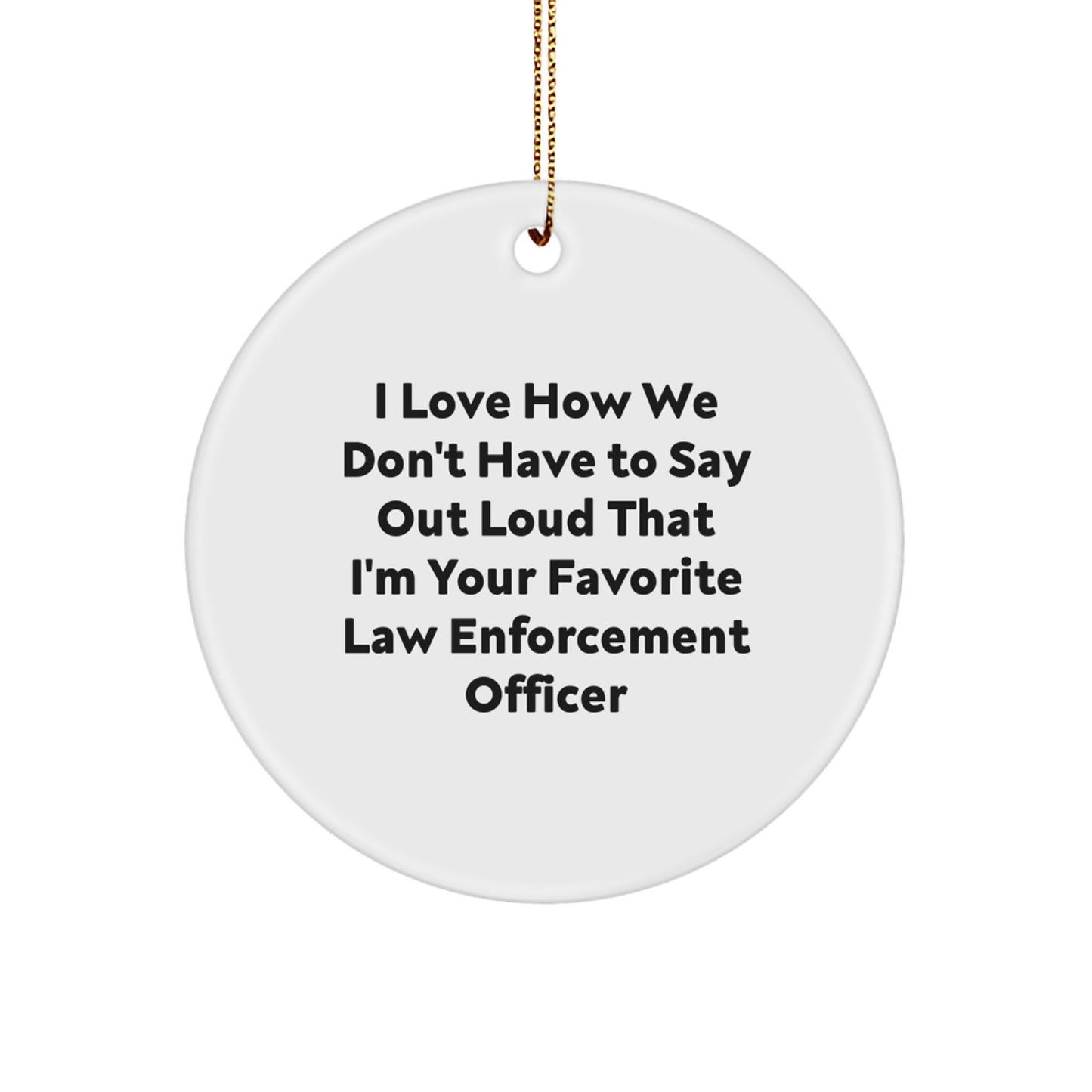 - Show your appreciation for the Law Enforcement Officer in your life with this unique Circle Ornament, featuring vibrant colors and a high-gloss finish. Made from durable MDF with a strong, engineered wood product, this ornament is lightweight and resistant to breaking, perfect for households with children or pets. '(I Love How We Don't Have To Say Out Loud That I'm Your Favorite Law Enforcement Officer)' is a thoughtful and humorous quote that will bring a smile to their face.