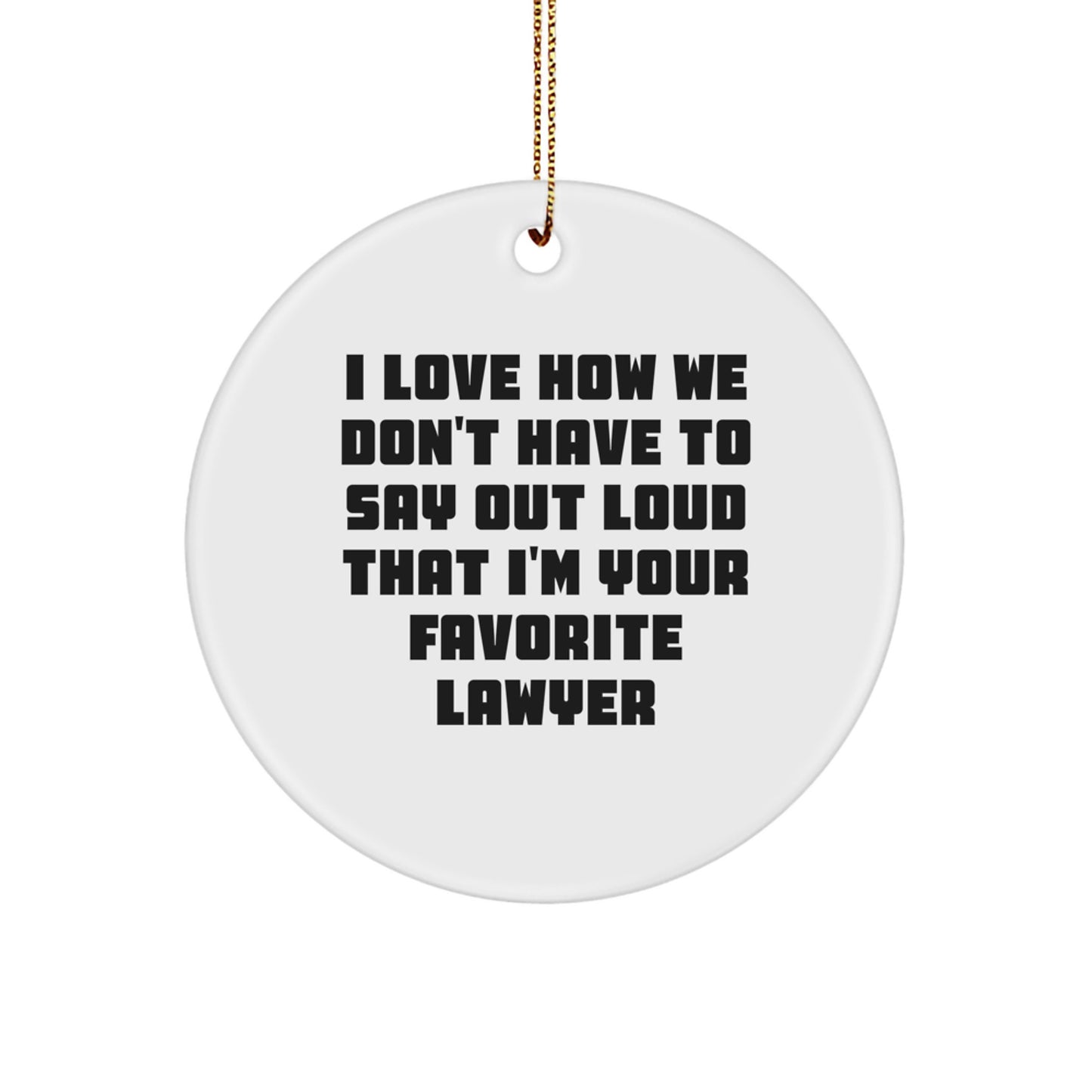 Are you looking for a humorous and unique gift for your favorite lawyer? Look no further! This circle ornament features the quote 'I Love How We Don't Have To Say Out Loud That I'm Your Favorite Lawyer' in a bright and colorful design. Made from sturdy MDF with a high-gloss plastic finish, this ornament is lightweight and resistant to breaking, making it perfect for households with children or pets. The vibrant print ensures that the design remains vivid and long-lasting. Whether you're a lawyer yourself or just a fan of the profession, this ornament is sure to bring a smile to your face. Give it as a gift to your favorite lawyer or keep it for yourself as a fun and quirky addition to your holiday decor. With its festive gold cord, this ornament is easy to hang and adds a touch of whimsy to any room. So why wait? Get your unique and funny lawyer gift today!