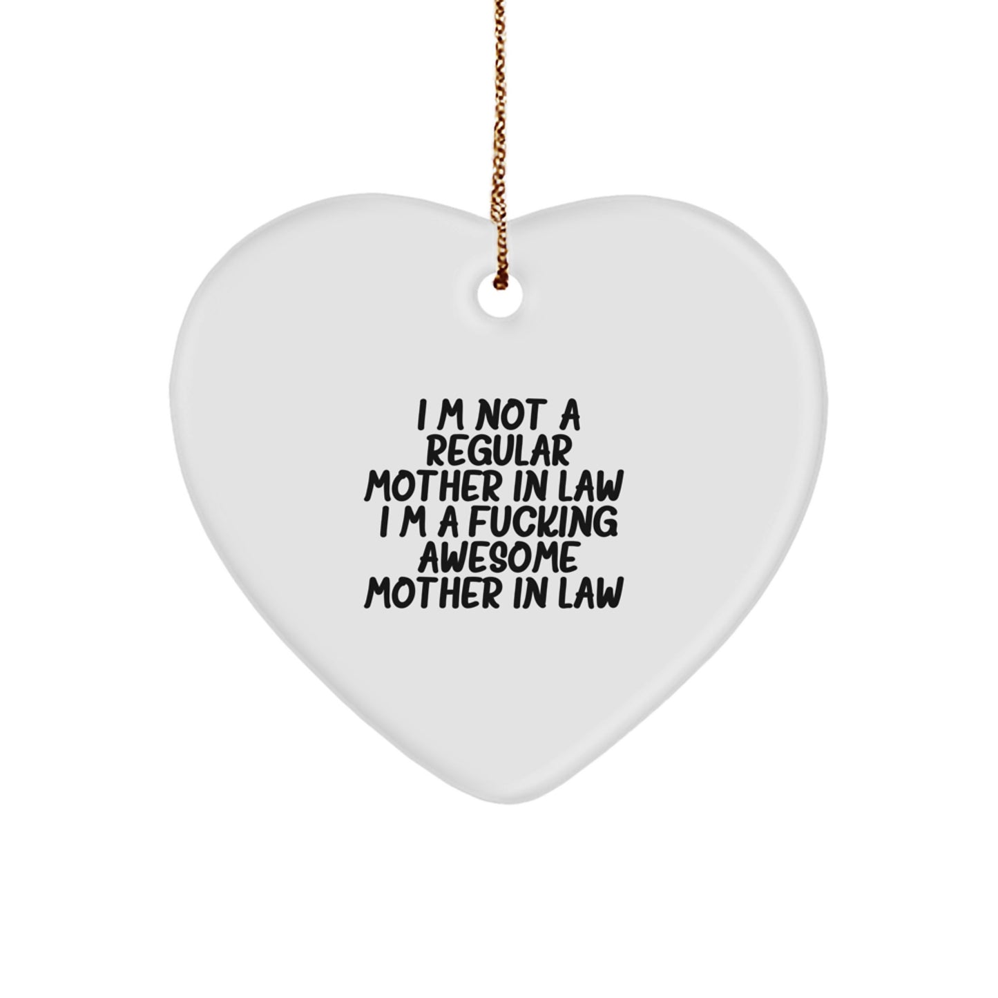 Are you tired of giving the same old gift to your awesome mother-in-law? Look no further! This hilarious 'I'm Not a Regular Mom-in-law' Heart Ornament is the perfect way to show her how much you care. Made from sturdy MDF with a high-gloss plastic finish, this ornament is lightweight and resistant to breaking, making it a great choice for households with children or pets. The vibrant printing ensures bright, vivid colors that will stand out on any Christmas tree.