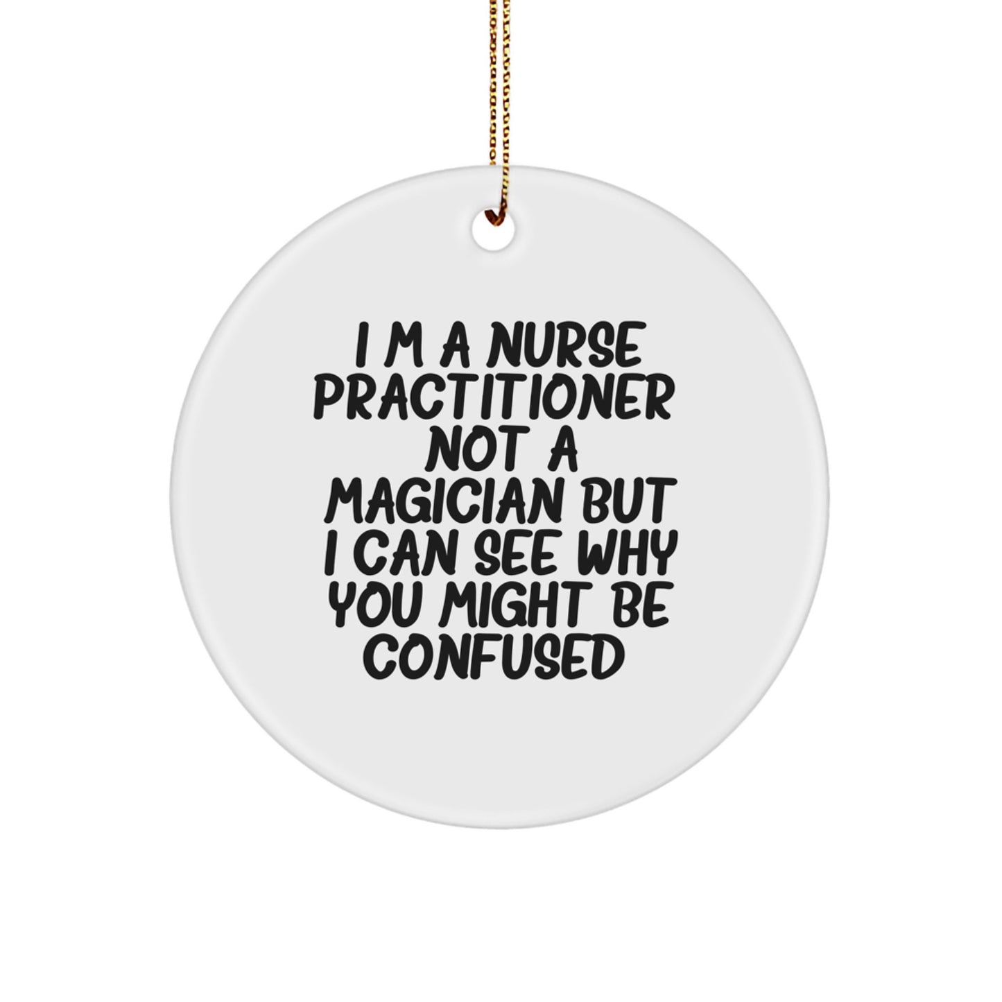 - Add a touch of humor to the Nurse Practitioner's home or office with this funny Circle Ornament, featuring the quote 'I'm A Nurse Practitioner. Not A Magician But I Can See Why You Might Be Confused.'