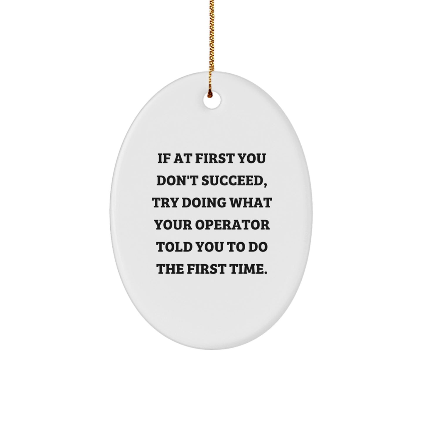 Get ready to delight your favorite Operator enthusiast with our hilarious Oval Ornament featuring the quote 'If At First You Don't Succeed, Try Doing What Your Operator Told You To Do The First Time.' This gift is sure to bring a smile to their face and a touch of festive cheer to their home for Christmas.