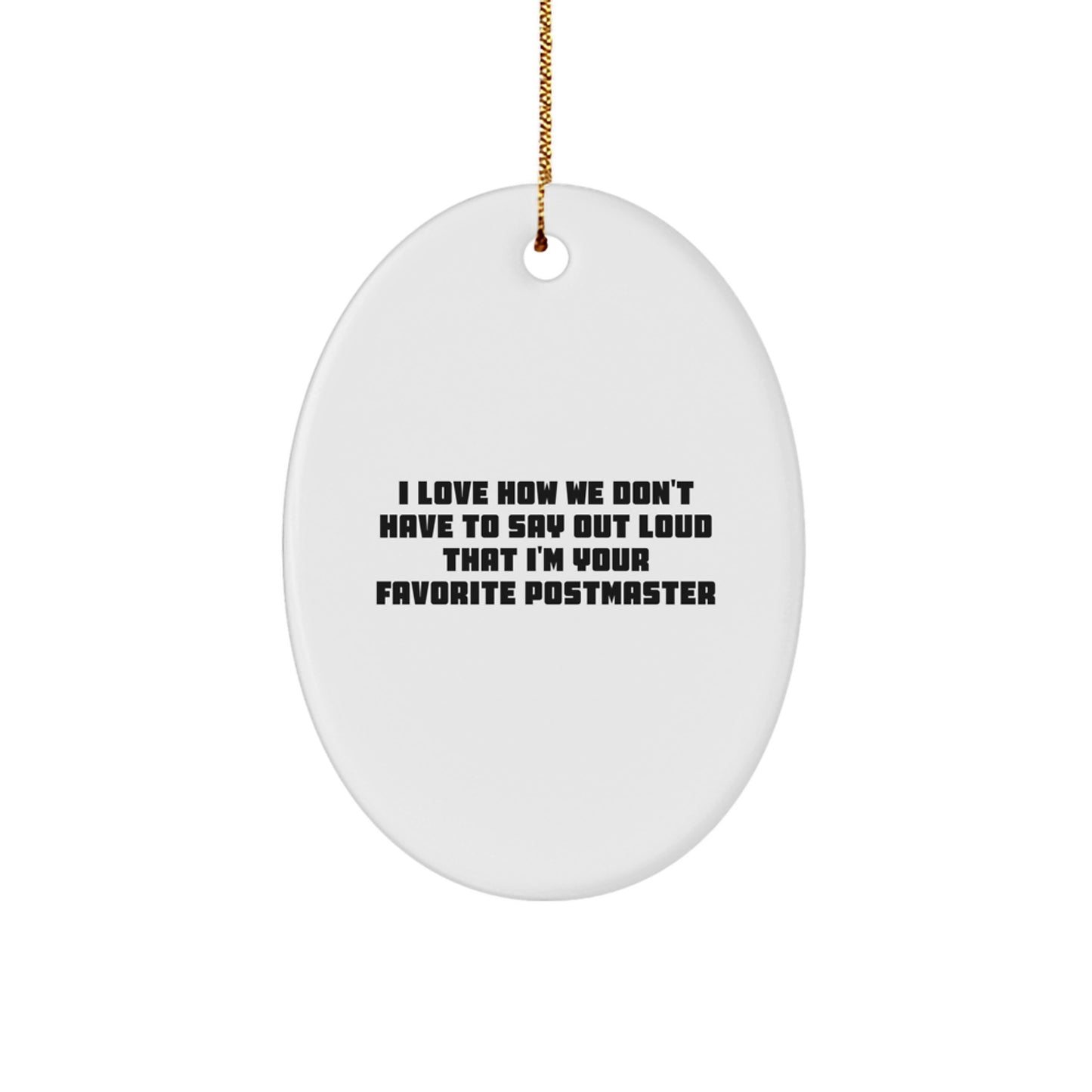- Experience the charm of 'I Love How We Don't Have To Say Out Loud That I'm Your Favorite Postmaster' with our Postmaster Oval Ornament, designed to bring joy to your loved ones this Christmas. Made from durable MDF with a high-gloss plastic finish, this ornament is crafted for long-lasting designs and vibrant colors that will stand out on your Christmas tree or mantel (200 chars).