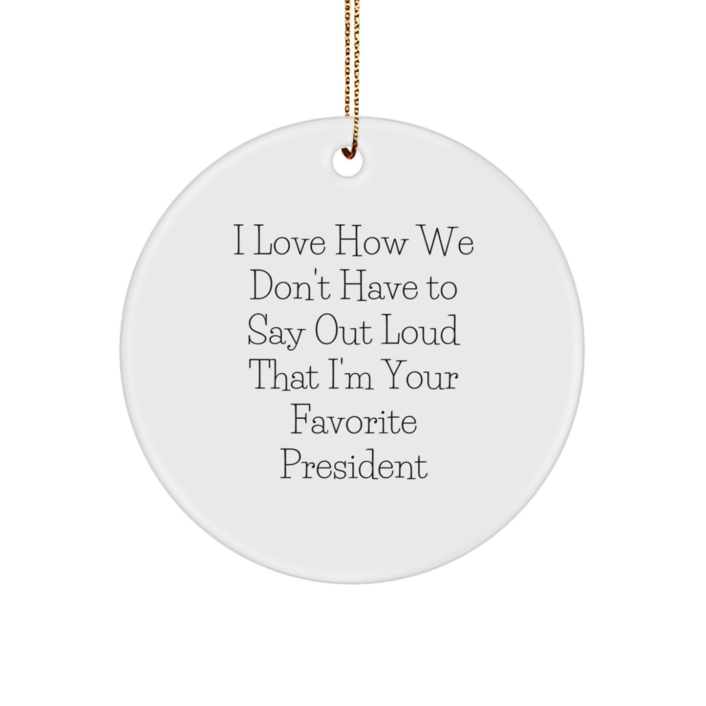 Are you a President enthusiast or looking for a unique gift for the President in your life? This funny and cute Circle Ornament is perfect for the holiday season. Made from sturdy MDF and printed with vibrant colors, it's a great choice for households with children or pets. The quote 'I Love How We Don't Have To Say Out Loud That I'm Your Favorite President' is a humorous way to show your appreciation for the President's leadership. Give this thoughtful gift to the President in your life and make them feel special. Whether it's a gift from friends or family, this Circle Ornament is a unique way to celebrate the holiday season.