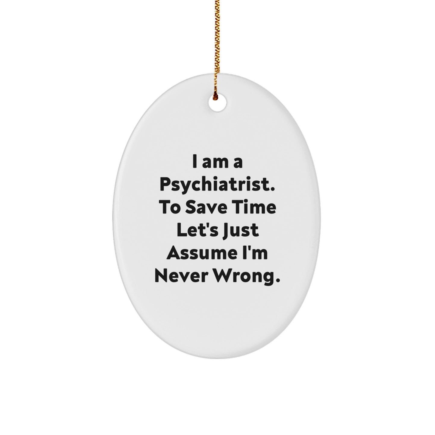 - The 'I'm Never Wrong' Oval Ornament is a must-have for any Psychiatrist enthusiast. The design is a smart take on the medical profession, and the vibrant colors will add a pop of fun to any room. This gift is perfect for a Psychiatrist friend who appreciates a good sense of humor.