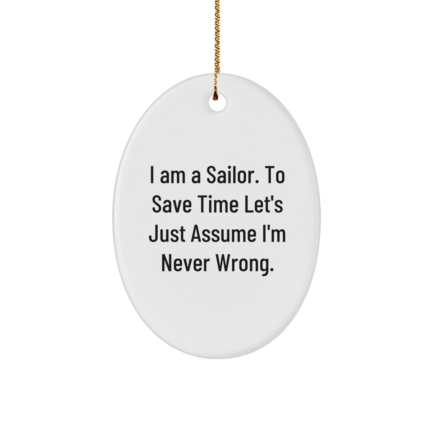 - Add a touch of sailor humor to your holiday decor with this unique and quirky 'I Am A Sailor. To Save Time Let's Just Assume I'm Never Wrong.' Oval Ornament.