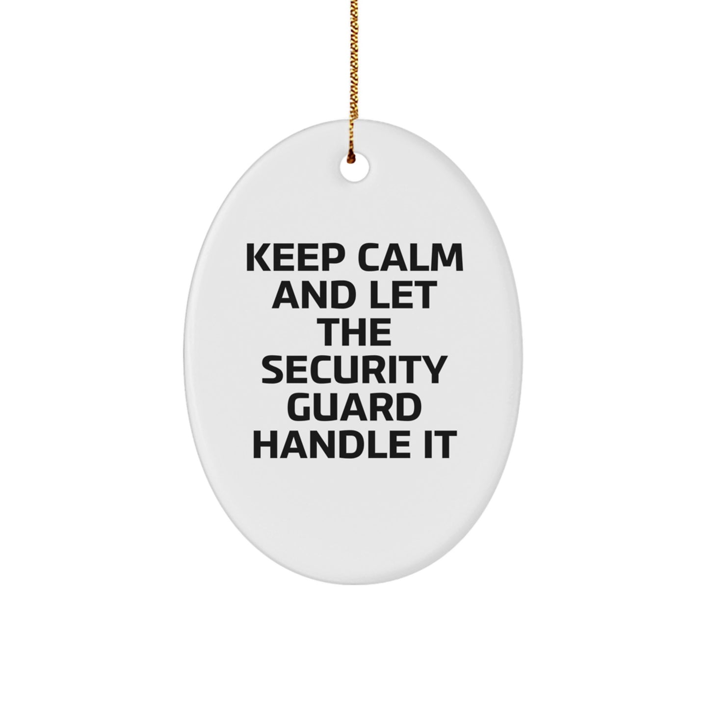 - Show your appreciation for the Security Guard in your life with this beautifully designed Oval Ornament. Made from sturdy MDF with a high-gloss plastic finish, it features the humorous quote 'Keep Calm And Let The Security Guard Handle It' and is a great way to add some humor and personality to any room. Whether you're shopping for a friend, family member, or coworker, this Oval Ornament is a wonderful gift for Security Guard men.