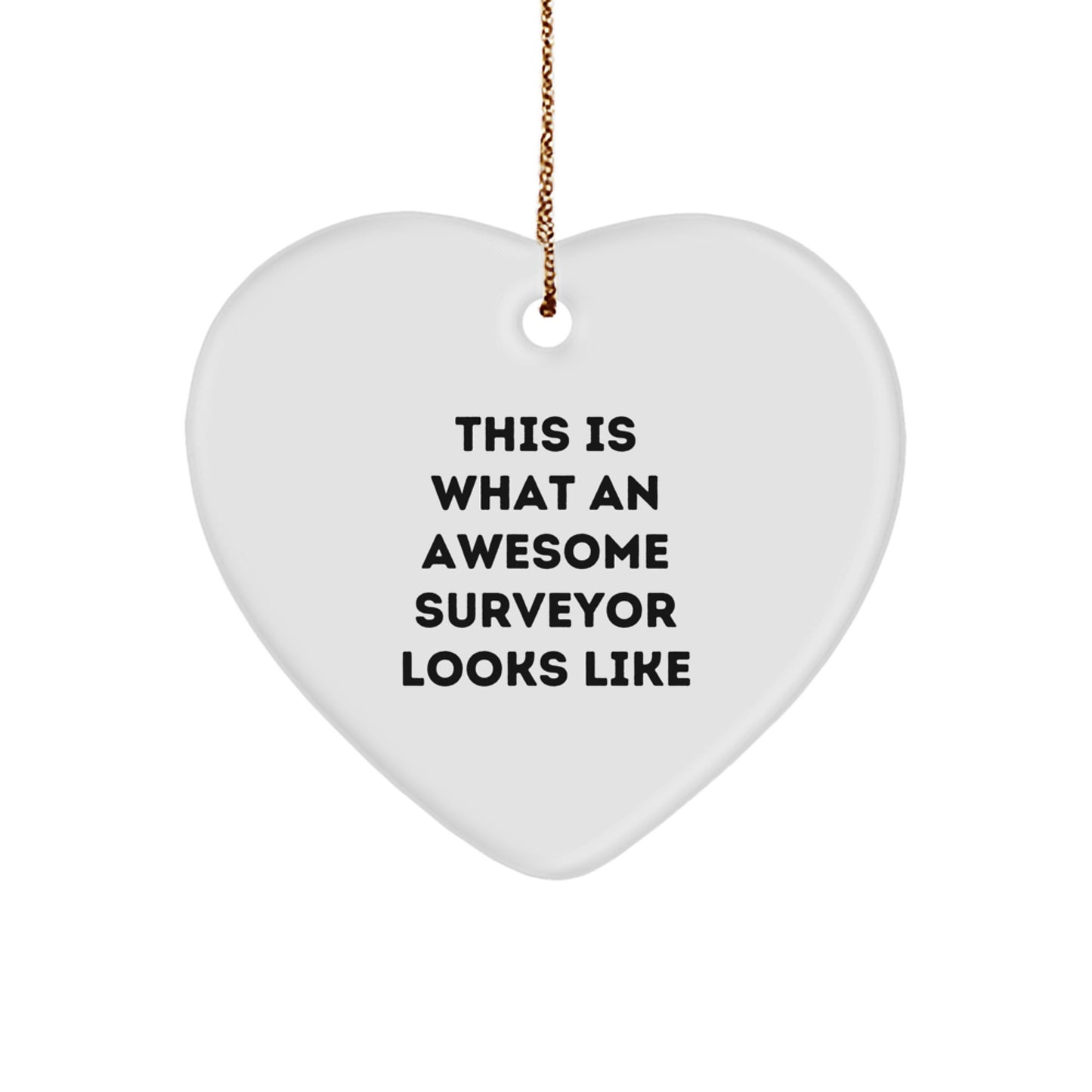 - Show your appreciation for the Surveyor in your life with this funny and unique Heart Ornament, featuring the quote 'This Is What An Awesome Surveyor Looks Like'.