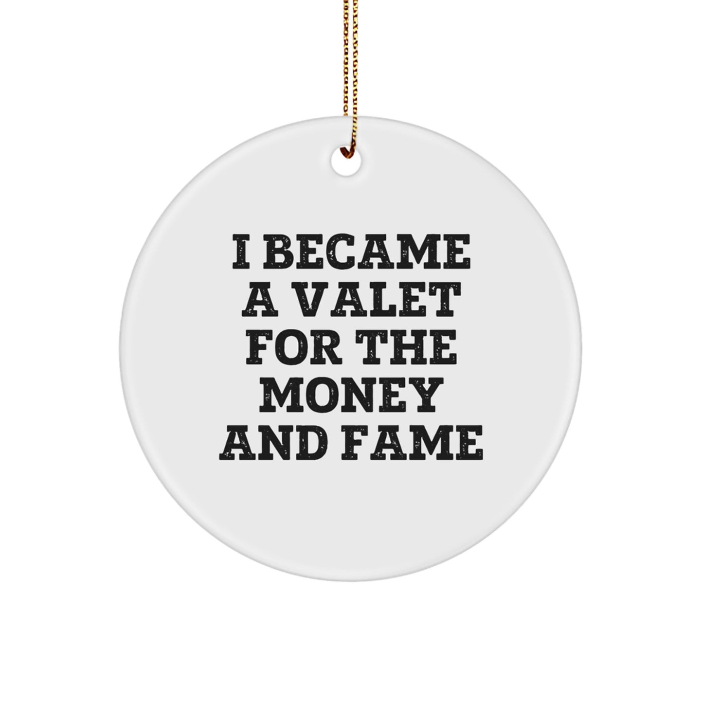 - This funny Circle Ornament is the ideal gift for any Valet enthusiast, featuring the hilarious quote 'I Became A Valet For The Money And Fame'. Made from sturdy MDF with a high-gloss plastic finish, it's lightweight and resistant to breaking, making it a great choice for households with children or pets.