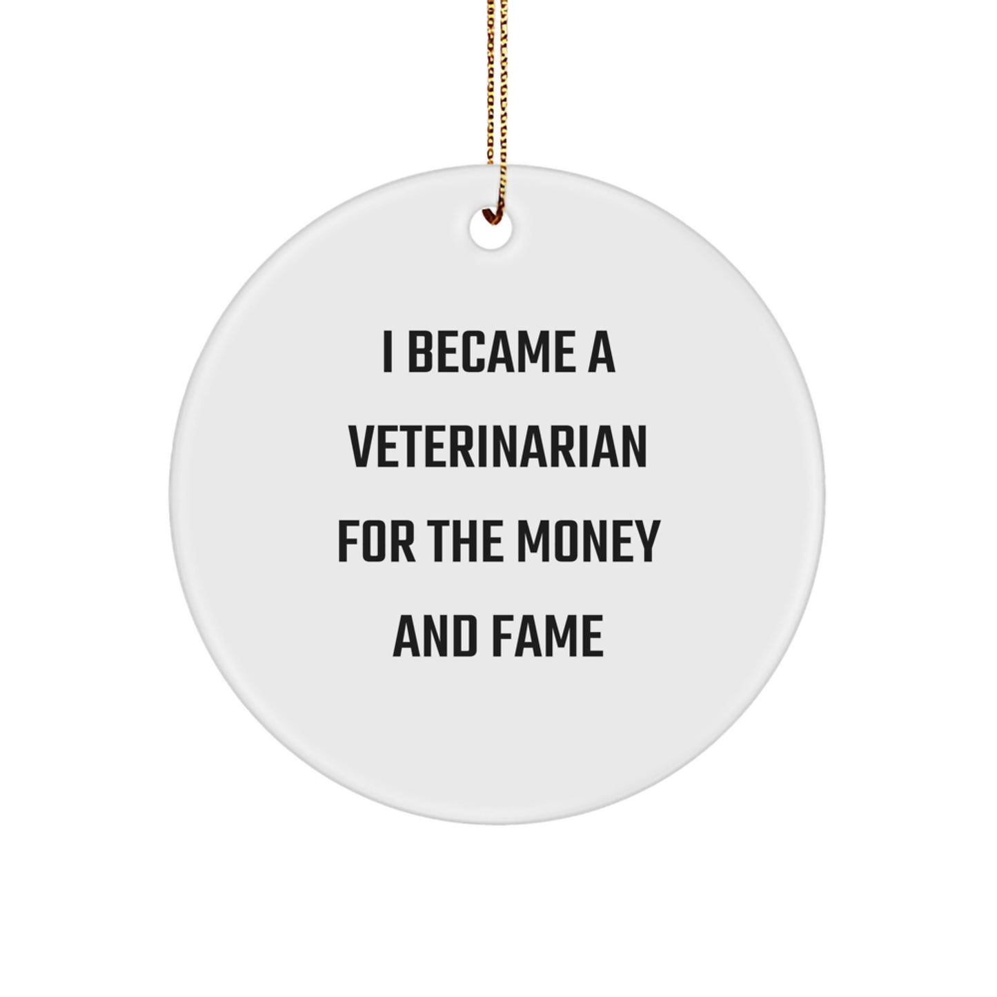 - Our 'I Became A Veterinarian For The Money And Fame' Circle Ornament is a funny and unique gift for the veterinarian in your life. Made from sturdy MDF with a high-gloss plastic finish, this ornament is not only visually appealing but also long-lasting. The vibrant colors and festive gold cord make it a great choice for stress-free decorating during Christmas and other special occasions.