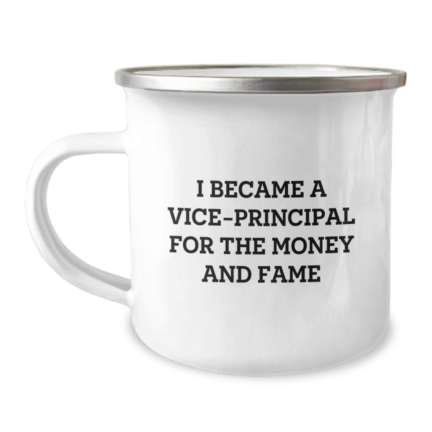 - This funny Vice Principal Camping Mug is made of high-quality stainless steel with an enamel finish, ensuring that it will last for a long time. The 12 oz capacity is perfect for hot or cold beverages, and the permanent printing won't fade after washing. Whether you're gifting this mug to a Vice Principal, a friend, or a family member, it's sure to bring a smile to their face. It's the perfect unique gift for any occasion, whether it's Christmas, a birthday, or just a random Tuesday.