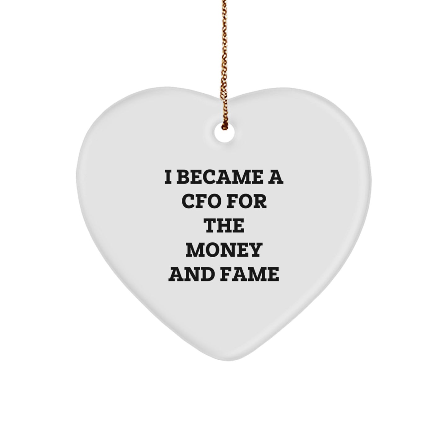 Are you or someone you know a master of finance, a CFO who's crushing it in the business world? This Christmas, give the gift of recognition to the CFO in your life with our unique 'I Became A Cfo For The Money And Fame' Heart Ornament. It's a thoughtful gesture that says 'you're the best' in a way that's both funny and sincere.
