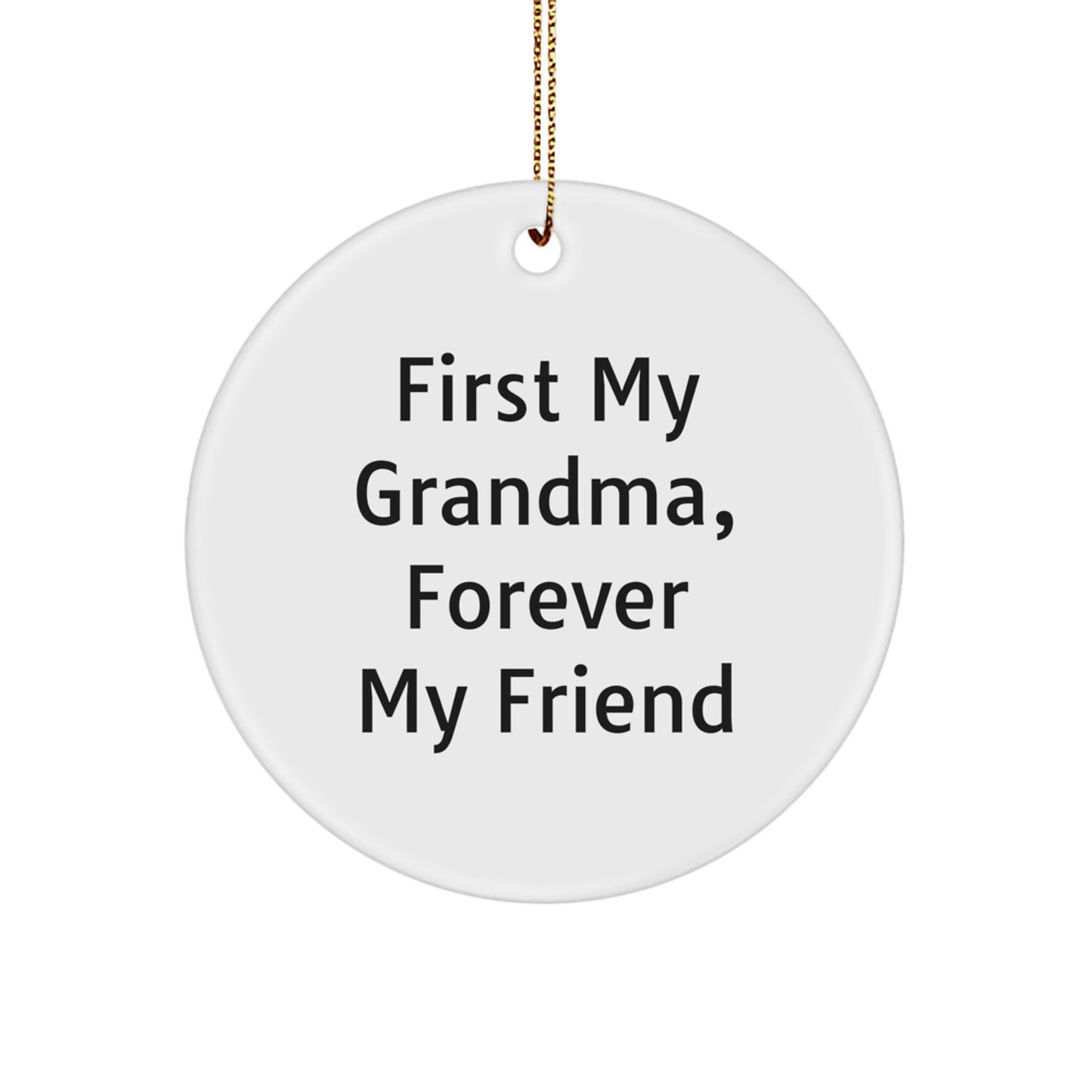 - A thoughtful and unique gift for your grandma this Christmas, featuring the quote 'First My Grandma, Forever My Friend' in a beautiful Circle Ornament.