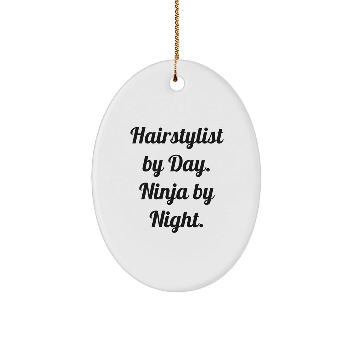 - This Oval Ornament is the ideal gift for hairstylists who work hard to make people look and feel their best. The quote 'Hairstylist By Day. Ninja By Night.' is a fun way to poke fun at the idea that hairstylists are ninjas in disguise.