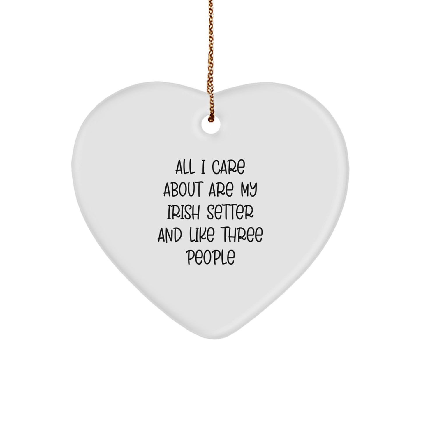 - Bring a touch of Irish Setter love to your holiday decor with this 'All I Care About Are My Irish Setter And Like Three People' heart ornament. Handcrafted from durable MDF with a high-gloss plastic finish, it's designed to withstand the rigors of daily use. Vibrant colors and crisp edges ensure a premium look that's sure to impress.