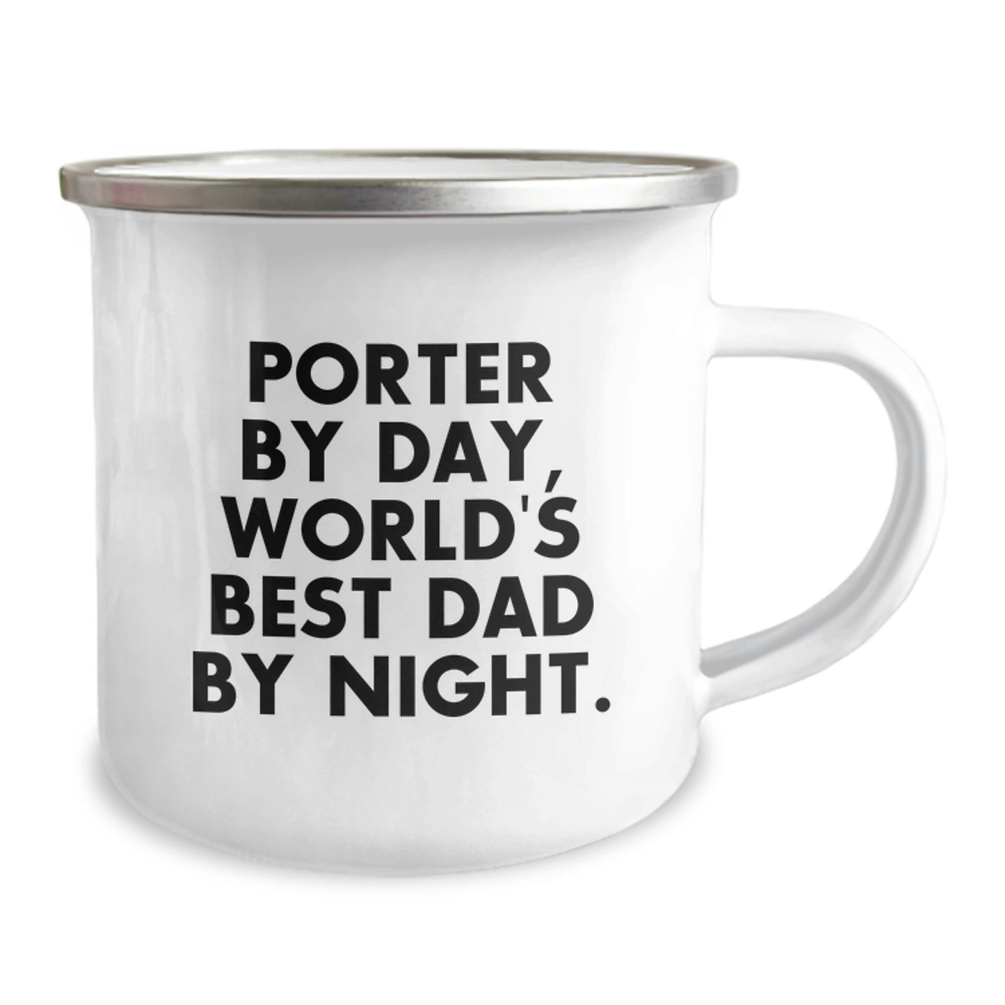 - Make any camping trip or outdoor adventure a memorable one with this Porter Camping Mug, perfect for the 'Porter By Day, World's Best Dad By Night.' dad in your life. With a stainless steel body and enamel finish, this mug is sturdy and easy to clean, making it a great addition to any camping gear.