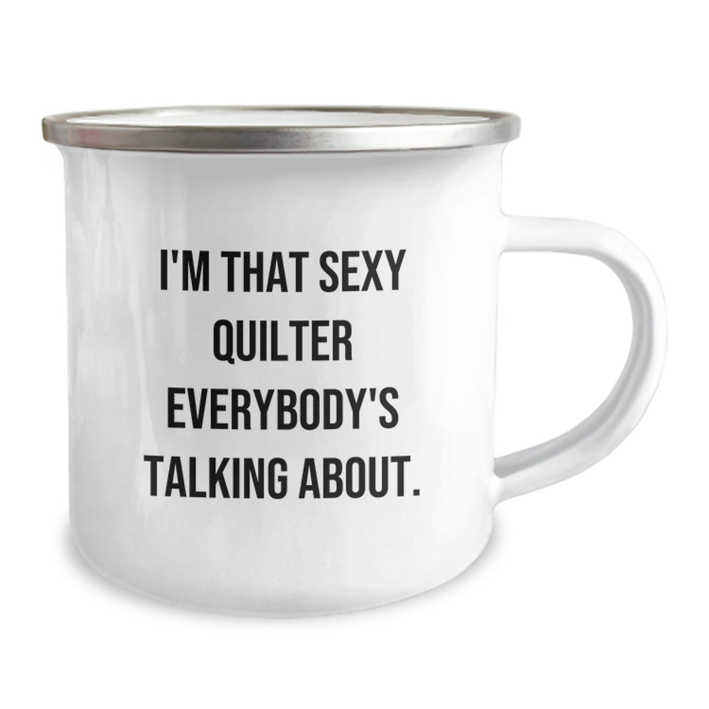 - This camping mug is the ideal gift for the quilter in your life, whether it's for Christmas or any other occasion. The funny quote 'I'm That Sexy Quilter Everybody's Talking About' is sure to get a laugh and make them feel special. The stainless steel construction and enamel finish make it perfect for camping trips, hiking, or any other outdoor adventure.