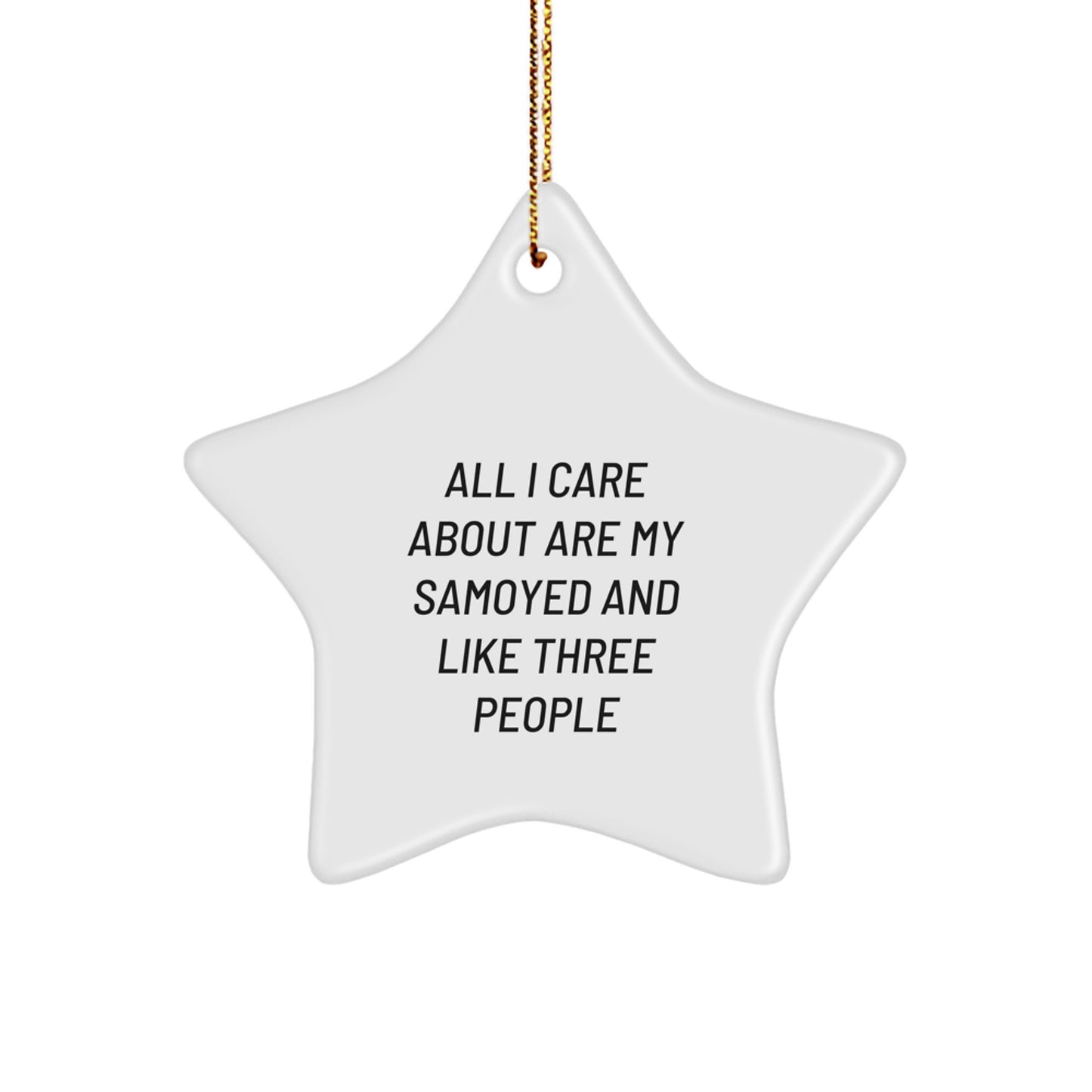 - Bring a smile to the face of any Samoyed Dog owner with this funny star ornament featuring the quote 'All I Care About Are My Samoyed And Like Three People'.