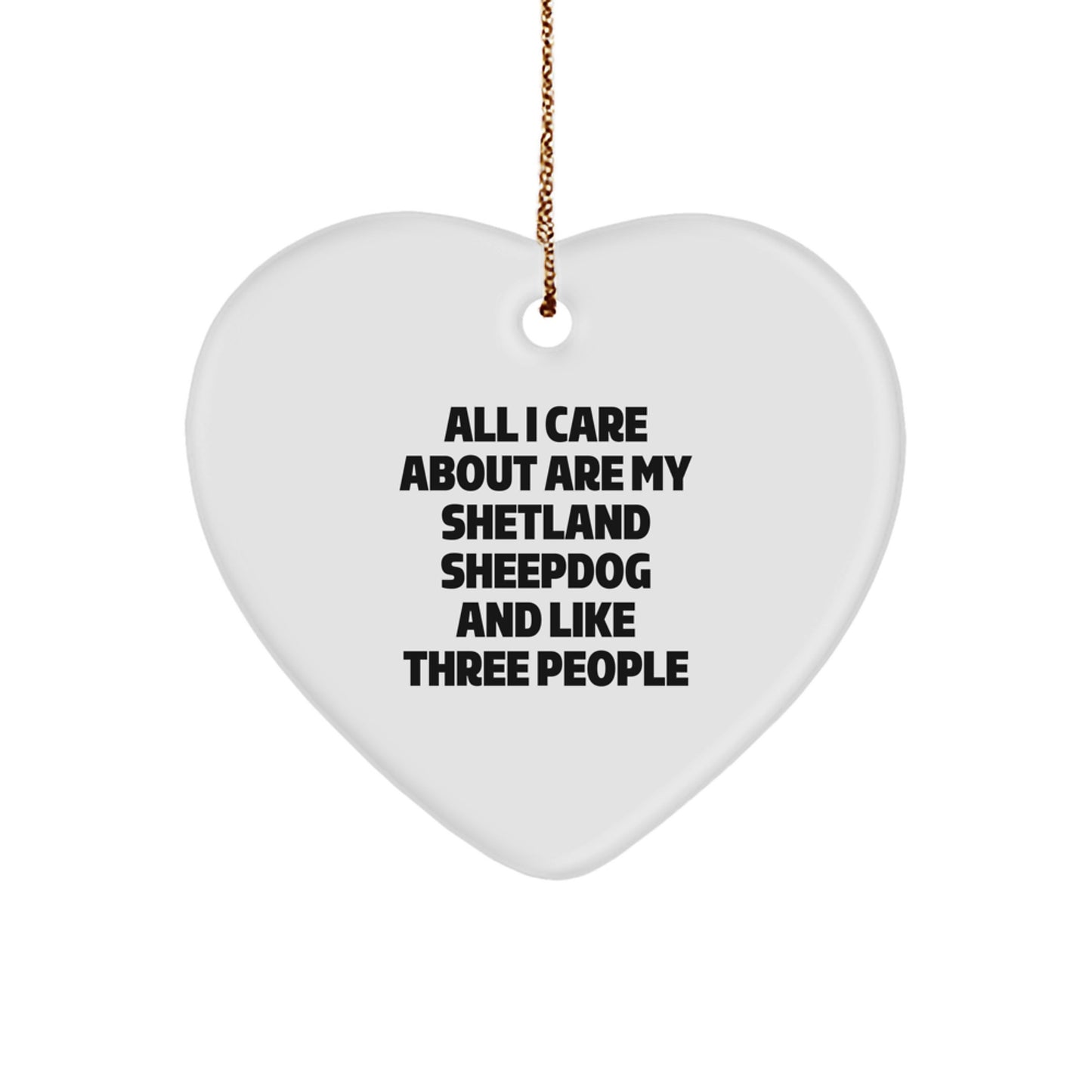 This beautifully crafted white heart-shaped ornament is printed with the quote 'All I Care About Are My Shetland Sheepdog And Like Three People' in a high-gloss finish. It's a unique and thoughtful gift for any Shetland Sheepdog lover. The quote's tone is funny and lighthearted, making it a great way to add some humor to your holiday decor. Whether you're shopping for a friend, family member, or coworker, this ornament is sure to bring a smile to their face.