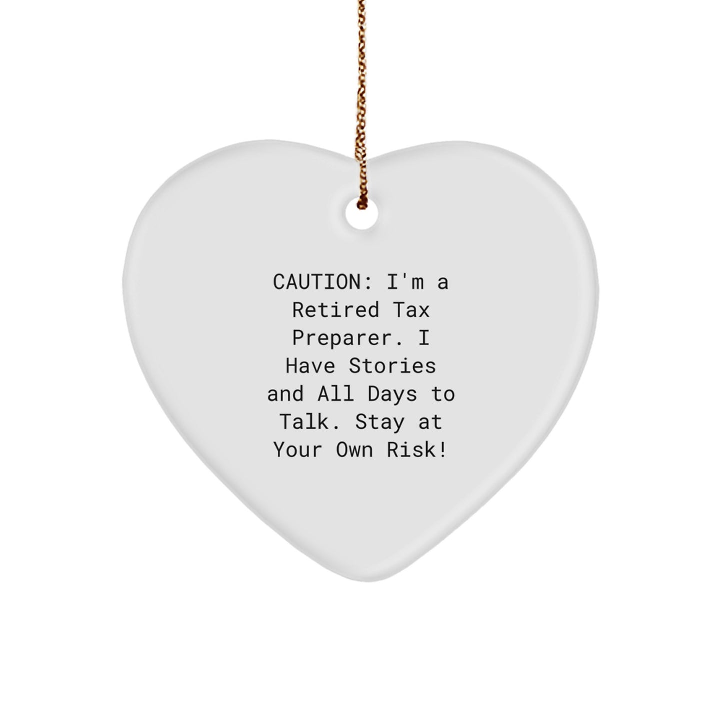 Are you looking for a unique gift for the Tax Preparer in your life? Look no further! This heart-shaped ornament is a thoughtful and humorous way to show your appreciation for their hard work and dedication. As a retired Tax Preparer, I know the importance of a good sense of humor, and that's why I've created this quote, 'Caution: I'm A Retired Tax Preparer. I Have Stories And All Days To Talk. Stay At Your Own Risk!' that's sure to bring a smile to their face.