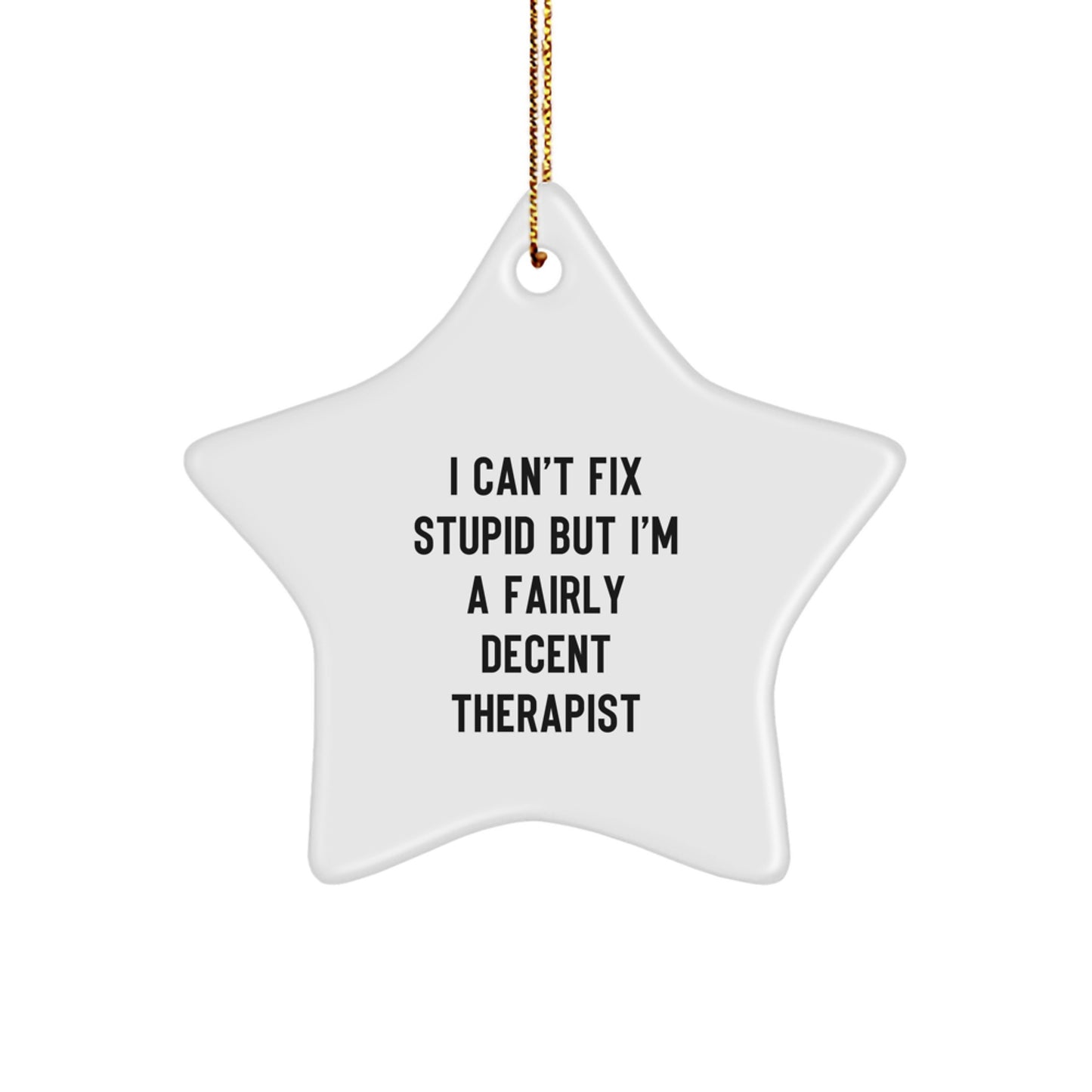 - This funny star ornament is a unique and thoughtful gift for a therapist who always makes you laugh. With its sturdy construction and vibrant colors, it's sure to brighten up any room. The quote 'I Can't Fix Stupid But I'm A Fairly Decent Therapist' is a fun and lighthearted way to celebrate the therapist in your life.