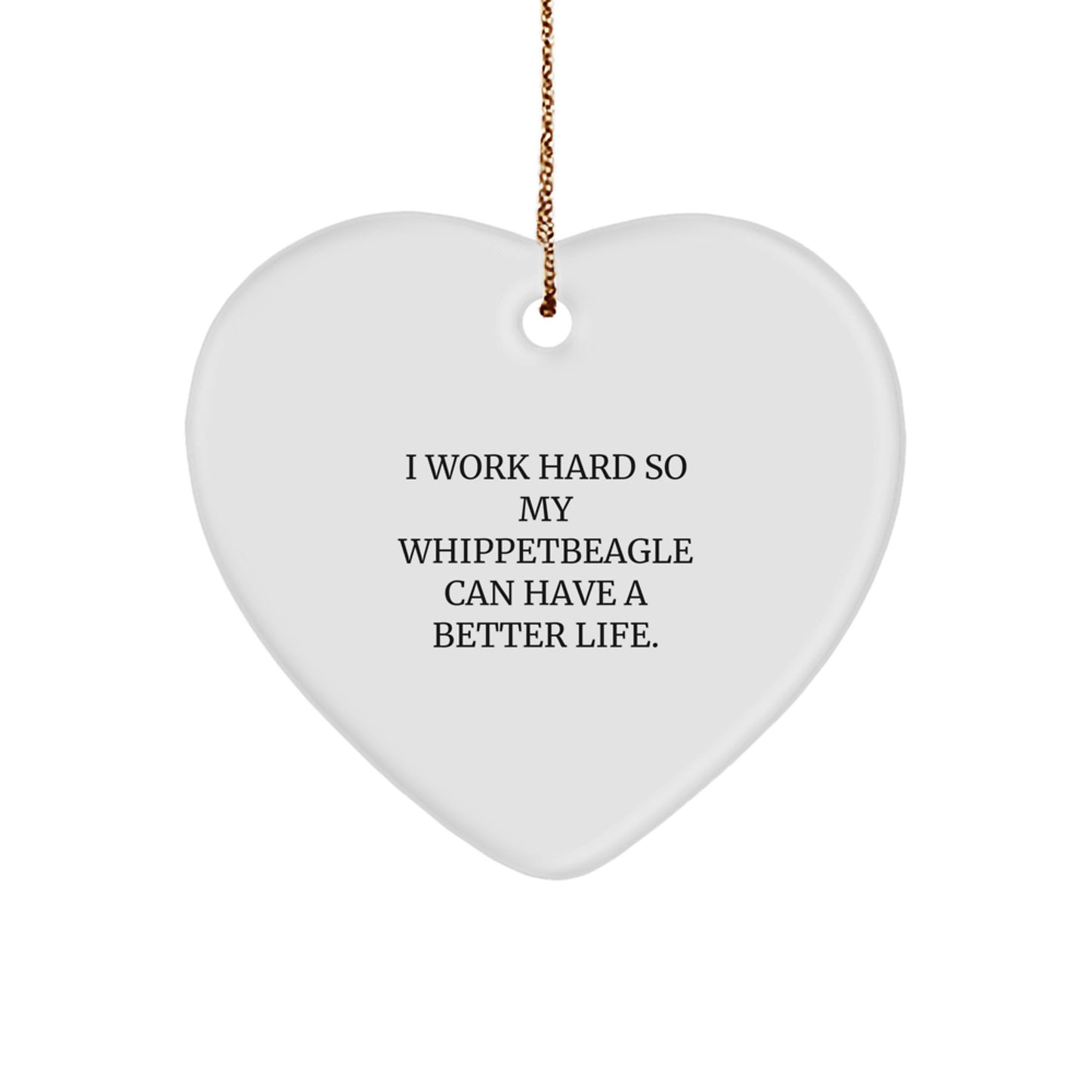 Are you a Whippet Dog enthusiast or a proud owner of this adorable breed? Look no further for a thoughtful gift to show your love and appreciation! This beautiful Heart Ornament, featuring the inspiring quote 'I Work Hard So My Whippetbeagle Can Have A Better Life.', is a unique and heartfelt present for your furry friend's human family or yourself.